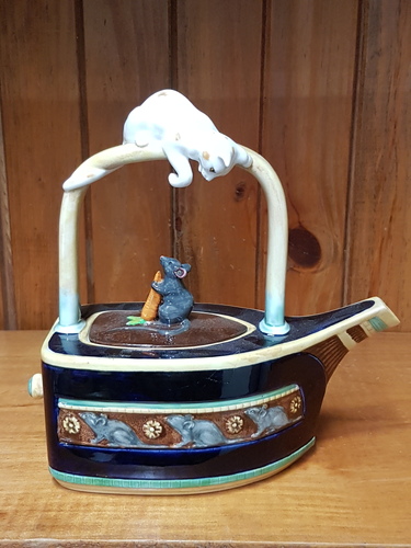 This Minton Cat & Mouse teapot demonstrates qualities of naturalism, humour & 'fitness for purpose' which was invented by the Victorians. The Minton Teapot features a cat perched on its handle pawing at a mouse sitting on the lid of the teapot.
