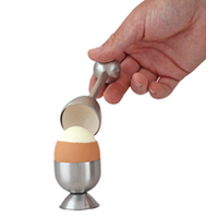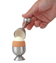 Place the base of the Egg Topper on top of the egg then pull the handle and release. The spring mechanism causes a vibration which helps the sharp edge of the topper to cut the shell.