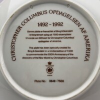 - This plate has been specially created by Bing & Grondahl in limited edition of 7,500 to commemorate the 500th Anniversary of the discovery of the New World by Christopher Columbus 1492-1992