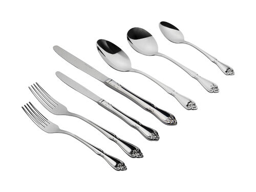Bring a sense of European tradition to your table with Rosabella. Inspired by vintage European silverware, each piece features ornate floral detailing & a radiant mirror finish. Crafted to elevate everyday dining & special occasions alike. Each setting evokes a love of shared meals & timeless elegance.