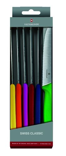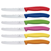 Bring color and function to the table with our tidy Swiss Classic Tomato and Table Knife. Each of the six pieces in this set of table knives has an ultra-sharp wavy edge designed for smoothly cutting through steak and pizza. And with its ergonomic handle and perfect size, you might even use it to cut everything else in the kitchen as well. Functional in purpose, but with a twist of fun in their juicy colorway of light green, blue, red, yellow, pink and orange, this set lifts the mood in any kitchen and at any table.